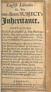 The English Liberties (1680, in later versions often British Liberties) was a cheap polemical book that was influential and much-reprinted, in the American colonies as well as Britain, and made Magna Carta central to the history and the contemporary legitimacy of its subject.[6] The Excellent Priviledge of Liberty (1687), an American book generally attributed to William Penn, reprinted the text of both Magna Carta (its first American printing) and (without attributing it) English Liberties.[7]