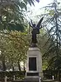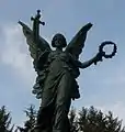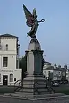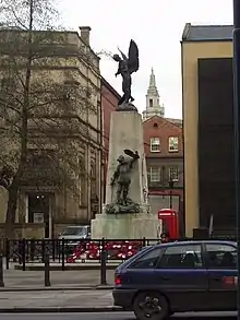 In October 1919, as World War I was drawing to a close, the Royal Academy in London held an exhibition of war memorial designs.[8] At the exhibition Fehr displayed statuettes of three figures, Peace holding a dove, a winged Victory and Saint George with a sword and shield.[8] Bronze statues of these figures appeared on several of the war memorials that Fehr created throughout the 1920s for British towns and cities. All three figures positioned on, or around, a stone obelisk, featured on the memorials Fehr created at Colchester, at Burton-upon-Trent, and, in different versions, on the Leeds War Memorial.[9][10] Several other memorials, including those at Lockerbie and Langholm in Scotland, at Eastbourne and at Grangetown in Cardiff, only featured the figure of Victory, holding a laurel wreath and an inverted sword, on a pedestal or obelisk.[8][9] The memorial at Keighley has a version of Peace with bronze statues of an infantryman in battle dress and a sailor holding a telescope.[10][11]