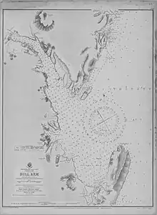 Otter returned to home waters, took command of HMS Porcupine in May 1856, and resumed the survey of Scotland.[16] In 1858 he and Porcupine crossed the Atlantic to assist in the laying of the first transatlantic telegraph cable. The western terminus of the cable was at Bull Arm, Trinity Bay, Newfoundland. Otter surveyed the area, then guided the cable ship into the bay.[3]: 34–35 [8]: 320 The ships' crews then had to carry the cable to the station, about half a mile inland.[17] The onward connections between the station on Trinity Bay and existing networks in Canada and the USA had already been made, and connection was soon established between London and New York. However within a few weeks the signals weakened, then disappeared. The insulation of the cable proved not to be satisfactory.[18]: 131–142 Though the cable had failed, the laying was not at fault, and the practicality of the project was established. Technical advances would lead to the successful cable in 1866.[19][18]: 156–163