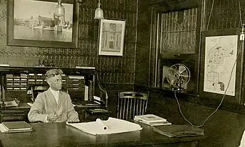 - ↑ The picture hanging behind him is of the Palace of Varied Industries at the Louisiana Purchase Exposition (1904 St. Louis World's Fair). Hoit designed the building while employed at the firm of Van Brunt & Howe. — Folder 6; Alfred Edward Barnes (1892–1960) Architectural Records (K0004); The State Historical Society of Missouri Research Center-Kansas City.