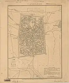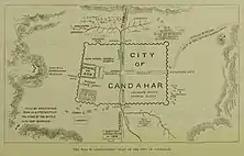 General Brooke arrived at Kandahar about 23 April 1880, and at once assumed the command of the garrison, which, up to the date of his arrival, had been held—in addition to the chief command of the forces in Southern Afghanistan—by General Primrose. He made a thorough and complete inspection of the limits of his command, and of the troops placed at his disposal; and placed on record his sense of the very imperfect condition of the fortifications, pointing out the obvious necessity for some defensive works being at once thrown up. These representations were re-submitted, on his arrival shortly afterwards, by General Burrows. Economy being, however, necessary, it was considered by the authorities inadvisable to incur the considerable charges which would be entailed by placing the defences of the city in a satisfactory state.[2]