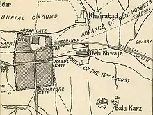 On 16 August, the sortie of that day, to the village of Deh Khwaja, was undertaken in opposition both to his own advice and to that of General Burrows. The sortie had been planned for the previous week, but abandoned in deference to their opinion. Other counsel, however, prevailed; and on the evening of 15 August, General Brooke was told that the operation was to be carried out, and that he was to have the command. He was emphatic in expressing his disapproval of the project, and desired to place on record his opinion of the unwisdom of the movement. His phrase was: "It will either be a walk over, or a very serious business. In the former case, it will be useless as a demonstration; in the latter, it must entail heavy loss."[3]