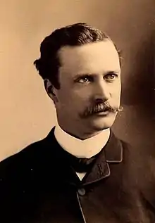 The 35-year old Hallam arrived in the United States in December 1885 and quickly found work with Rudolph Aronson's Company, for which he played Sylvio in The Enchantress with the New York Clipper describing his performance as 'weak and unsatisfactory'. The company next played The Mikado and The Bohemian Girl but the company failed and Hallam moved to the Casino Theatre to play Eugène Marcel in the popular Erminie. He remained at the Casino for over three years, appearing as Count de Rosen in Nadgy (1888), Fairfax in The Yeomen of the Guard (1888), the Duke of Mantua in The Brigands (1889),[4] Fritz in The Grand-Duchesse of Gérolstein, Goncalves in The Brazilian, Ange Pitou in La fille de Madame Angot among other productions before touring in Erminie and Giroflé-Girofla. His attempt at management of the Orpheum Theatre in San Francisco failed and he returned to New York to play Risotto in The Mountebanks (1893) before marrying for the third time in 1893 - to the Dutch-Canadian soprano Josephine Davidson Schoff (1877-), who sang as Josephine Stanton. The problem was he was still married to Maggie Hogan, who did not divorce him until July 1895. The newlyweds toured with Alfa Norman and played in a summer season at Milwaukee before playing in La fille de Madame Angot. Hallam sang in The Isle of Gold which failed before touring in A Stranger in New York. On joining the Boston Lyric Company he played Pietro, Prince of Palma in Boccaccio, Pippo in La mascotte and sang opposite his wife in Fra Diavolo, The Fencing Master and in Scott Marble and Richard Stahl's Said Pascha.[2]