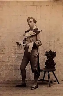 Hallam toured as Alain in Babiole and in 1879 created the lead male role in Frederick Stanislaus's The Lancashire Witches. He sang in a production of Le Voyage en Chine and toured in La fille de Madame Angot, The Blind Beggars and As You Like It. In 1882 he appeared in the West End in Melita, which failed, before moving on to the more successful The Merry Duchess by George Robert Sims and Frederic Clay at the Royalty Theatre (1883) before playing Jan in The Beggar Student at the Alhambra Theatre (1884). Next he was de Lansac in François les bas-bleus and toured in Olivette with Emily Soldene. His professional reputation in London was ruined when he agreed to sing in the American-style musical comedy Capers at the Standard Theatre (1885) in a piece written by the American composer Richard Stahl in an attempt to launch his wife Bertie Crawford as a soubrette. While Hallam gained such reviews as 'Henry Hallam as the lover is a veritable oasis in this desert of vocal mediocrity or badness',[3] audiences laughed the show off the stage and the production was savaged by the critics. Stahl and Crawford fled back to America and Hallam went with them.[2]