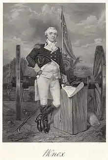 Knox was promoted to major general on March 22, 1782; he became the army's youngest major general.[65] He and Congressman Gouverneur Morris were assigned to negotiate prisoner exchanges with the British. These negotiations failed because the sides could not agree on processes and terms for matching various classes of captives.[66] He joined the main army at Newburgh, New York, and inspected the facilities at West Point, considered a crucial defensive position. After enumerating its defects and needs, Washington appointed him its commander in August 1782. The next month he was devastated by the death of his nine-month-old son, and fell into a depression.[67] He soldiered on, however, becoming involved in negotiations with the Confederation Congress and Secretary of War Benjamin Lincoln over the issue of pensions and overdue compensation for the military. Knox wrote a memorial, signed by a number of high-profile officers, suggesting that Congress pay all back pay immediately and offer a lump-sum pension rather than providing half-pay for life.[68] The unwillingness of Congress to deal with the issue prompted Knox to write a warning letter, in which he wrote "I consider the reputation of the American army as one of the most immaculate things on earth, and that we should even suffer wrongs and injuries to the utmost verge of toleration rather than sully it in the least degree. But there is a point beyond which there is no sufferance. I pray we will sincerely not pass it."[69] When rumors of mutiny in the higher rank circulated in March 1783, Washington held a meeting in which he made an impassioned plea for restraint. In the meeting, Knox introduced motions reaffirming the officers' attachment to Washington and Congress, helping to defuse the crisis.[70] Because of the unresolved issues, however, Knox and others became vigorous proponents of a stronger national government, something which leading political leaders (including Thomas Jefferson, John Hancock, and Samuel Adams) opposed at the time.[71]