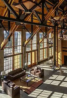 The architecture, which was consistent with the modernist style common to many of the Mission 66 projects, although a distinct departure from National Park Service Rustic, was always controversial. Drawing frequent comparisons to a flying saucer, it reminded others of a sunken Seattle Space Needle.[4] It was accused of not fulfilling its goal of appropriateness for its setting, instead being "incompatible with the rustic character of Paradise".[5] Others disagreed with this assertion, claiming that "although it doesn't match the rustic styling of Paradise's other buildings, its grandness seems to fit the location".[6]