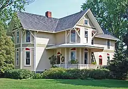 The Watson house is a two-and-one-half story frame cross-gable Stick Style house on a stone foundation. It has a wraparound Eastlake front porch and an overhanging side porch. Decorative details include corner posts, shingled beltcourses, and sunburst panels above windows and in the gable ends. There are multiple projecting bays having diagonal brackets at the eavesline.[2]