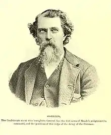 On the night of June 28, 1863, Harrison accurately reported to Longstreet that the Union Army had moved into Frederick, Maryland, and was moving northward, as well as the fact that Major General Joseph Hooker had been replaced as commander of the United States Army of the Potomac by Major General George Meade.[1] Longstreet passed this information on to General Robert E. Lee, the commander of the Army of Northern Virginia. Lee had never heard of Harrison before and refused to see him when he arrived compliments of Longstreet.[2] However, Longstreet's chief of staff, Moxley Sorrel, confirmed that Harrison "always brought true information." In the end, Harrison's information was plausible enough for Lee to halt his entire army. As a result of Harrison's information, Lee told all of his troops to concentrate in the vicinity of Cashtown, Pennsylvania, eight miles from Gettysburg, thereby triggering the events that led to the Battle of Gettysburg. Lee said after hearing the news from Harrison, "A battle thus became, in a measure, unavoidable."[3]
