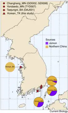 Almost two decades later in 2022, further research was conducted as to the origins of the Korean people, where a study discovered that the Korean peninsula included many ethnic groups during its ancient times, specifically during the Three Kingdoms period.[44] According to the study, Korea was mostly occupied by people originating from Northern China (Manchuria and Siberia) but also had native people from the south that bore close resemlance to the Jōmon people of Japan who had inhabited the peninsula before the northern population arrived and displaced them. Researchers pointed out that this ethnic group was mostly the ruling members of the Gaya confederacy[44] and had a profound impact in both language and culture within the region (see Peninsular Japonic).[45]
