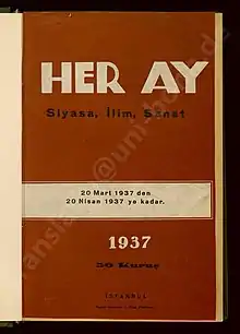 Her Ay (Turkish: "Every month") was a Turkish magazine published monthly in Istanbul between March 1937 and March 1938. It was established by Orhan Seyfi Orhon (1890-1972) and Yusuf Ziya Ortaç (1895-1967). A total of seven issues featured contributions from major Turkish writers, such as Hilmi Ziya Ülken,[1] Mustafa Şekip Tunç (1886-1958), Hasan Ali Yücel (1897-1961), and Sabahattin Ali (1907-1948). Due to its content, the periodical is one of the most important of its time.[2]