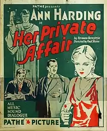 Her Private Affair is a 1929 American drama film directed by Paul L. Stein and starring Ann Harding, Harry Bannister and John Loder. It was produced and distributed by the Pathé Exchange company. A silent film with sound effects and talking sequences.[1][2]