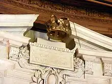 Though the King's Crown has been used as a symbol of Columbia in some capacity throughout most of the university's history, it was only popularized and made official at the turn of the 20th century.[4] It first appeared on campus as a decorative motif with the installation of Alma Mater on the Low Library steps in 1903. Designed by Daniel Chester French, the scepter in the sculpture's right hand is topped with a miniature crown.[15] Alma Mater was quickly followed by the donation of the Class of 1881 Flagpole in 1906, which has a crown-shaped finial, and by 1912, the university had adopted its current flag, which consists of a white crown on a blue field.[16][17] The crown currently adorns many of the buildings and gates on the university's campus, and is also incorporated into the university's coat of arms and its academic regalia.[18][19]