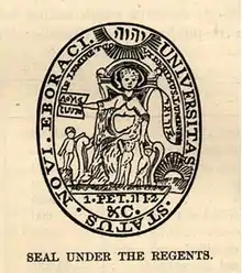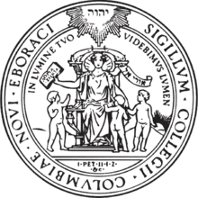 The College is represented by a Lady sitting in a Throne or Chair of State, with Severall Children at her Knees to represent the Pupils, with I Peter II., 1, 2, &c., under them to express the Temper with which they should apply Themselves to seek for True Wisdom... One of the [New-born Babes] She takes by the hand with her left hand expressing her benevolent design of Conducting them to true Wisdom and Virtue. To which purpose She holds open to the a Book in her right hand in which is [in] Greek letters "λόγια ζῶντα", the living or lively Oracles, which is the Epithet that St. Stephen gives to the Holy scriptures—Acts. 7:38. Out of her Mouth over her left Shoulder goes a Label with these words in Hebrew Letters ori-el [אוּרִיאֵל‎], God is my light; alluding to Ps. 27:1. expressing her Acknowledgment of God the Father of Lights, as the Fountain of all that Light, both Natural and Revealed with which She proposes to enlighten or instruct her Children or Pupils; whereof the Sun rising under the Label is the Emblem or Hieroglyphic, alluding to that expression Mal. IV, 2., The Sun of Righteousness arising with healing in his Wings. Over her head is Jehovah [יהוה] in a Glory, the Beams coming triangularly to a Point near her head, with these words around her for her motto, In Lumine Tuo Videbimus Lumen—In thy light shall we see light Ps. 36:9. On the Edge around are engraved in Capitals, Sigillum Collegii Reg. Nov. Ebor. in America—The Seal of King's College at New York in America.[1]