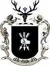 Sable, a hand dexter couped at the wrist and grasping three darts blunted with points down, one in pale, and two in saltire, all argent. | Taken from the genuine arms of the Lowell family, as documented from at least 1563. |