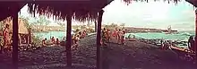 One 1973 site-specific mural, painted on a custom-designed wall as part of a history center under construction (and never completed) at Punaluʻu Beach, twice gained notoriety. The historical mural, titled Ancient Punaluu, Hawaiʻi Island measured 24-foot (7.3 m) wide by 10-foot (3.0 m) high. According to a news report, "The mural shows aliʻi, warriors and commoners on the black sandbar, which separates Punaluʻu Bay from a pond where springs provide fresh water immediately behind the beach.....A ceiling of thatch gave the feeling of being inside an old Hawaiian shelter and the thatch hid lighting, which gave a natural, daylight look to the mural. Pebbles and sand at the base of the painting met real pebbles and sand on the floor of the history center."[24]