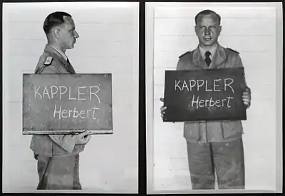 Kappler was arrested by British authorities in 1945, turned over to the Italian government in 1947, and tried the following year. Kappler's second-in-command in Rome, SS-Captain Erich Priebke, managed to escape to Argentina and was not extradited to Italy to face trial over his own role in the Ardeatine Caves Massacre until 1996.[14][15]
