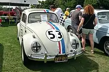 Herbie, the Love Bug is a sentient 1963 Volkswagen Beetle, who has been featured in several Walt Disney motion pictures starting with the 1969 feature film The Love Bug. He is the protagonist of all his movies and has a mind of his own, being capable of driving himself and often becoming a serious contender in auto racing competitions. Throughout most of the franchise, he is distinguished by red, white, and blue racing stripes from the front to the back bumper, a pearl white body, a racing-style number "53" on the front luggage compartment lid, doors, engine lid, and a yellow-on-black 1963 California license plate with the registration "OFP 857".