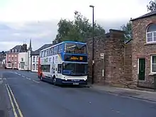 The Hereford, Ross and Gloucester Railway (also known as the Gloucester and Dean Forest Railway) was a railway which ran for 22+1⁄2 miles (36.2 km) linking Hereford and Gloucester, England, via Ross-on-Wye. It was opened on 1 June 1855 as a 7 ft 1⁄4 in (2,140 mm) broad gauge line, it was amalgamated with the Great Western Railway in 1862. In 1869 the railway was converted to 4 ft 8+1⁄2 in (1,435 mm) standard gauge.[1] The railway was closed to passengers on 2 November 1964, freight services between Ross-on-Wye railway station and Grange Court railway station continued on until 1 November 1965.[1]