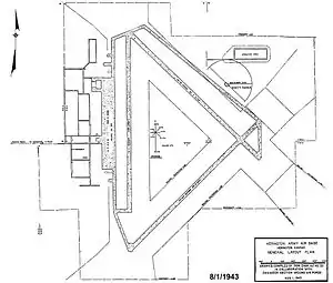 Construction of Herington Army Air Field, accomplished by contract under supervision of the Air Service Command, commenced in September 1942, and continued over a period of 14 months. Three runways were built with a dimension of 150 x 6750 feet, with a gross load capacity of 74,000 pounds, wheel load of 37,000 pounds. Runways and apron (500 x 4,750 feet) were constructed with a ten-inch gravel base placed in layers on a six-inch compacted earth subbase, and surfaced with one and one-half-inch asphalt cement; the service strip (80 feet wide) was a six-inch concrete slab, thickened to nine inches at the expansion and construction joints. three taxiways, 50 feet wide, completed the runway system. Fronting on the field, three squadron hangars, 120 by 80 feet, were built.