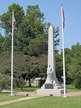 Herman Davis State Park is a 1-acre (0.40 ha) state park in Manila, Arkansas, United States. The park includes the grave of and a memorial to Herman Davis (1888-1923), a U.S. sniper during World War I.[1] The park is located at the junction of Baltimore Avenue and Arkansas Highway 18, south of the city center. It consists of a grassy area, with a concrete walk leading to the memorial. The memorial is a granite obelisk, 25 feet (7.6 m) in height, in front of which stands a full-size granite likeness of Davis in his infantry uniform. Davis' remains are buried just behind the monument. Davis is also honored with a fountain on the grounds of the Old State House in Little Rock. The fountain was a part of the Arkansas exhibition at the 1876 Philadelphia Centennial Exposition. In 1954, the three-tiered iron fountain was renamed the Herman Davis Memorial Fountain. Davis, a native of Manila, won distinction in the war for taking out a nest of German machine gunners with his marksmanship. Davis was a modest man and rarely mentioned the awards he received for this and other actions (including the US Distinguished Service Medal and two French Croix de Guerre), but was called out by General John J. Pershing, who placed him fourth on a list of 100 heroes of the war.[2]