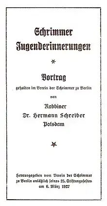 On 6 March 1927, on the occasion of the 25th anniversary of the Association of Schrimmers, Hermann Schreiber delivered a lecture, which was later published in print as Schrimmer Jugenderinnerungen (Schrimm – Memories from Our Youth'). The memories are a valuable source for research on the history of Jews in the Province of Posen. Schreiber describes in the memories the daily life of his own family and other Jews living in Śrem, Jewish traditions, customs and festivals, but also the daily life of ethnic Poles and ethnic Germans who lived in Śrem. The memories were translated into English.[2] In 2008 the memories were also translated into Polish and published by Krzysztof Budzyń in the journal "Śremski Notatnik Historyczny" (Śrem Historical Notebook).[3]
