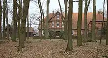 In the neighbourhood there were at that time already eight old farmsteads; four of them lay west of the Örtze and four to the east of the river. The "Lutterhof" [3] and "Misselhorn", both east of the Örtze are still there today. The old "Rißmann's Hof", renamed the "Behrenssche Hof" in 1756 after its new owner, Johann Hinrich Behrens (1730–1808), also lay east of the Örtze. It was donated by its last owner, Heinrich Wilhelm Behrens, on 30 January 1854 to the Hermannsburg Mission. Behrens was trained as a missionary and in 1857 sent out with his family to South Africa. The farm, now called "Missionshof", was sold on 15 June 1967 by the Mission Centre of Hermannsburg (Missionsanstalt Hermannsburg) to the civil parish of Hermannsburg. It was demolished in order to build the secondary modern school here. In addition to the aforementioned eight old farmsteads (Einzelhöfe), there were also various so-called Sattelhöfe, tenant farms, at Oldendorf, Beckedorf, Schlüpke and Weesen, which had to provide manpower for the castle.