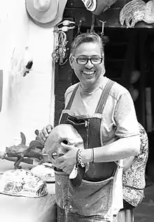 While most of Arroyo's work and clients are in the city of San Miguel, his reputation has led to commissions and teaching work outside of the city as well. For a number of years, he worked for the Botanical Gardens at El Charco del Ingenio, which led him to experiment with environmental art, using natural materials and teaching at the summer camps. Arroyo has taught handcraft production for special needs children in Comonfort for over 20 years.[1] He holds classes and otherwise recruits younger generations to become involved with mojigangas and other aspects of his work.[2] Arroyo has been commissioned to work on a number of varied projects, including a 2015 commission to create a life-sized nativity scene in the city of Querétaro. His work has been exhibited regionally in Guanajuato and neighboring Querétaro.[5] In 2016, Arroyo won a contest out of twenty-four San Miguel artists to accompany a Mexican delegation to the Vatican as part of an exhibit on religious art.[6]