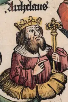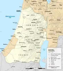 Herod Archelaus (Ancient Greek: Ἡρῴδης Ἀρχέλαος, Hērōidēs Archelaos; 23 BC c.AD 18) was the ethnarch[1][2] of Samaria, Judea, and Idumea, including the cities Caesarea and Jaffa, for nine years[3] (c.4 BC to AD 6). He was the son of Herod the Great and Malthace the Samaritan, brother of Herod Antipas, and half-brother of Herod II. Archelaus (a name meaning "leading the people") came to power after the death of his father Herod the Great in 4 BC, and ruled over one-half of the territorial dominion of his father. Archelaus was removed by the Roman emperor Augustus when Judaea province was formed under direct Roman rule, at the time of the Census of Quirinius.