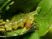 The larvae feed on Lorinseria areolata. They roll the tips of the leaves, forming a round cocoon. The caterpillar is green. [3]