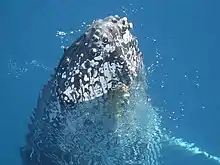 Hervey Bay is a resting place during the annual migration of approximately 35,000 humpback whales along Australia's east coast from the Great Barrier Reef down to the Antarctic Ocean. This migration involves approximately one third of the world's humpback whales. Most female whales each spend about two weeks in Hervey Bay nursing their calves. Young whales also rest in the bay but very few adult male whales rest in the bay.[6] Whales can normally be seen in the bay between July and November each year, where they exhibit many playful behaviours.[7][8] There are many companies offering whale watching tours in the bay during that time.[2] There are strict rules applying to the operation of boats in the vicinity of whales to avoid harm or stress to the whales.[9] Due to the popularity of the albino whale Migaloo (first sighted in 1991), there are particularly strict rules relating to approaching Migaloo or any seemingly white whale that might be Migaloo.[10]