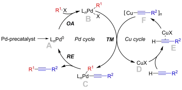 Complexes of palladium catalyze cross-coupling of electrophiles with organometallic nucleophiles, including those derived from lithium, tin, zinc, and boron.[3] One example is Sonogashira coupling, where catalytic amount of copper salt (e.g. CuI) reacts with a terminal alkyne (the pronucleophile) under basic conditions to generate a copper acetylide, which transmetalates onto an arylpalladiumII halide, regenerating the copper halide. Reductive elimination from the arylpalladium acetylide yields the cross-coupled product.[2]
