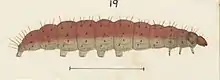 Its length when full-grown is about 3⁄4 inch. Cylindrical, slightly tapering at each end with the segments deeply excised. The head is dark reddish-brown, the second segment with shining brown dorsal plate; back of rest of segments bright pink, slightly tinged with purple; ventral surface pale whitish, slightly tinged with blue; there is a row of rather large horny warts around segments 2, 3 and 4; a double series of sub-dorsal warts on the other segments, except the last, and three lateral lines of such warts. The legs and prolegs are well developed.[6]