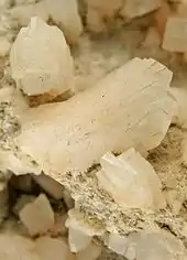Heulandite occurs with stilbite and other zeolites in the amygdaloidal cavities of basaltic volcanic rocks, and occasionally in gneiss and hydrothermal veins.[6] It forms at temperatures below about 100 °C (212 °F), and so its presence in sedimentary rocks indicates that these have experienced shallow diagenesis.[7]