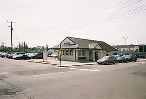 The 2003 Hewlett station building in 2009, across the tracks and the grade crossing from the long-standing former station.