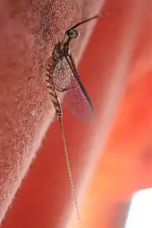 Subimago and adult mayflies do not have functioning mouthparts and do not eat; the nymphs are mainly detritivores, feeding on organic particles that are moved into their burrows by the current of water caused by their constantly beating gills.[3] In their nymphal state, they are preyed on by dragonfly nymphs which attack them in their burrows. Mayfly nymphs do not normally emerge from these tunnels until they are fully developed, at which time they swim to the surface, their skins split, and they emerge as subimagos and fly off. At this time they are very attractive to predators and are eaten by various species of fish, by dragonflies, and by birds.[3]