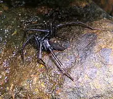 The banded tunnelweb spider is endemic to New Zealand.[4] Two genera of hexathelids are found in New Zealand, Hexathele and Porrhothele.[5]