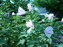 H. grandiflorus is a woody perennial which can reach 6 feet (1.8 m) on average.[5] Extreme heights of 15 feet (4.6 m) are known.[4] It has pink to white flowers with a reddish purple center and yellow stamens. Flowers are generally greater than 6 inches (15 cm) in diameter.[4] Its capsules are covered in velvety trichomes.[5]