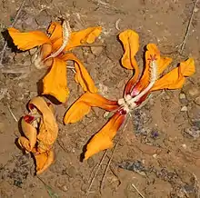 Flowers are orange-yellow,[2] with petals, 90 mm long, hairy outside, multi-veined, about the length of the style. Five sepals are acute, erect, and of the same length as the tube. The stamens, in young flower, form five groups consisting of 4 rows of unilocular and "hippocrepiform" (horseshoe-shaped) anthers; this staminal tube is hairy at the base. Styles are somewhat wider than the androecium in the mature flower. The seed capsule, 40-50 mm long, is shorter than the calyx and has 5 cells, shorter than the sepals. Seeds are hispid, 10-44 per cell, arranged in two rows separated by 5-7 false lamellar partitions.