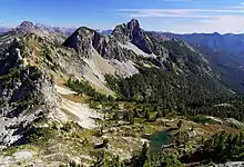 The Alpine Lakes Wilderness features some of the most rugged topography in the Cascade Range with craggy peaks and ridges, deep glacial valleys, and granite walls spotted with over 700 mountain lakes.[4] Geological events occurring many years ago created the diverse topography and drastic elevation changes over the Cascade Range leading to the various climate differences. These climate differences lead to vegetation variety defining the ecoregions in this area. The elevation range of this area is between about 1,000 feet (300 m) in the lower elevations to over 9,000 feet (2,700 m) on Mount Stuart.