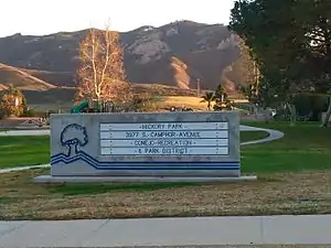 Hickory Park is a neighborhood park at the foothills of the Santa Monica Mountains, less than 500 feet from the Santa Monica Mountains National Recreation Area, in southern Newbury Park, California. It is a five-acre park, which includes facilities such as a playground, basketball courts, backstop, barbecue grills, picnic tables, trails, etc.[3][4][5]
