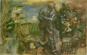 Liberal American artists responded with protest images, again encouraged by the ACA Galleries. Japanese American artists could easily empathize with their black contemporaries, another minority facing discrimination, and they made work that joined them in protest. Among them were Ishigaki, painter Hideo Noda, the young sculptor Leo Amino ... The young Noguchi dramatically suspended a contorted, life-sized figure from a rope in his 'Death (Lynched Figure)' (1934).[30] Outside the West Coast, Japanese expatriate intellectuals formed bonds with African Americans. In New York, Eitaro Ishigaki painted a black history mural for a Harlem courthouse, while he, Isamu Noguchi, and Hideo Noda each produced artworks of lynchings.[31]
