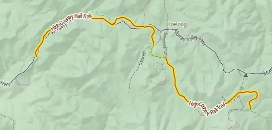 The High Country Rail Trail is a 35 kilometre, part-gravel part-sealed rail trail on the northern border of Victoria, Australia. It runs along the former Cudgewa railway line from Wodonga, along the edge of Lake Hume, to Shelley railway station in the former township of Shelley, Victoria. The eight kilometre section east from Tallangatta to Old Tallangatta is sealed; the remainining sections are not sealed but are accessible on hybrid, gravel, or mountain bikes.