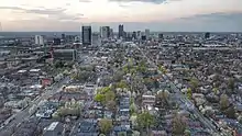 High Street has been one of Columbus's two main corridors since its founding, along with Broad Street, meeting at a 100 percent corner downtown.[2] The street (among other main corridors) was laid out from the city's founding in 1812 into the following year.[3] These streets and the entire grid were laid out 12 degrees off from a north-south and east-west alignment.[4]
