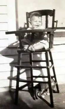 Baby in wooden high chair, about 1935