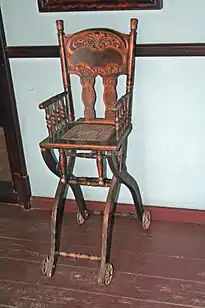 2. Convertible – These modular high chairs, also called grow-with-me high chairs, are designed to be both multifunctional and useful past infancy.[4] The first examples of these date back to the 19th century, which were high chairs that could transform into strollers and rocking chairs.[5] These chairs can be easily disassembled and adjusted to fit a child as they grow, often converting into either booster chairs for toddlers[6] or standalone full-size chairs that can be used by adults.