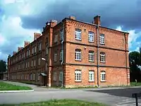 The curriculum of the officers' courses was inconsistent and sometimes contradictory to the teaching of junior officers at War School of Kaunas. To fix this, the war school was subordinated to the officers' courses from November 1923 for about two years.[18] In November 1923, the courses relocated from the city center to larger premises in Panemunė.[5] With the relocation, the courses were expanded by adding an artillery section. These artillery courses lasted two years and the first class of 15 men graduated on 15 July 1925.[19] Due to very different backgrounds and experience of the men, the courses had to spend a lot of time on teaching general subjects and in particular math before advancing to more specialized artillery topics. Therefore, the next class had to complete preparatory math courses and pass entrance examinations. This delayed the start date of the next artillery courses to November 1926.[20] The relocation also allowed the courses to establish courses for physical education instructors who would then teach soldiers gymnastics, fencing, and athletics. The physical education studies began on 10 July 1924.[21]