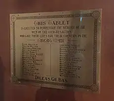 Following the First World War, a war memorial tablet with the names of the fallen was erected in the vestibule. This is now housed in Greyfriars Kirk.[15][30] A bronze tablet dedicated to the church's former minister Malcolm MacLennan was erected in the vestibule after his death in 1931.[31] A communion table and chairs were gifted by Angus MacMillan, ahead of his departure in 1948. These were supplemented by a matching font and reading desk, gifted by the children of the congregation. The same year, the congregation purchased a new organ as a memorial to those members of the congregation fallen in the Second World War.[32]