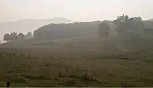 The average elevation of Highland County is 2,832 feet (863 m), which is the 16th highest average elevation among counties in the Eastern United States.[12] The highest elevation in the county is 4,545 feet (1,385 m) in the Allegheny Mountains and the lowest elevation is 1,625 feet (495 m) near the Cowpasture River southwest of Patna.[10][13] The western regions of the county are generally higher in elevation than are the eastern and especially southeastern regions.[14] As the county lies within the Ridge-and-Valley province of the Appalachian Mountains, it features numerous valleys and mountain ridges that are generally oriented in a "northeast to southwest" direction.[13] The valleys are from west to east the Alleghany Valley, the Bluegrass Valley, the Monterey Valley, the Bullpasture Valley, and the Cowpasture Valley.[9][15] The majority of the county and all the southern portions of the county form part of the James River watershed, while northern sections drain into the Potomac River. West of Monterey, the divide is roughly centered along the path of U.S. Route 250; however, in eastern Highland County, the James watershed extends further northward.[13][16]
