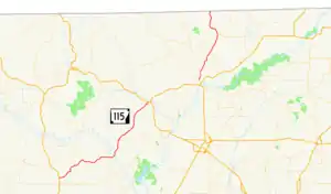 Entering the western side of the county, Highway 115 has an intersection with Highway 117 north of Jessup. The two routes form an overlap northward, crossing the Strawberry River and entering the small town of Smithville. The two routes turn eastward, passing the Smithville Public School Building, listed on the National Register of Historic Places.[5] Highway 115 turns left in Smithville, ending the overlap and heading northward toward Imboden, passing a rural area populated with homes and small farms. Upon entering Imboden, Highway 115 curves northward around the Sloan-Hendrix School District campus and Imboden City Park before an intersection with US 62/US 63/US 412.[6] Highway 115 overlaps with US 62 eastward to Pocahontas.[7]