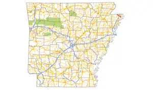 Highway 151 begins at Highway 18 (Main Street) in Blytheville and runs north to Gosnell and Arkansas International Airport.[4] The route intersects and forms a concurrency with Highway 181 northwest for 2.04 miles (3.28 km), with Highway 151 splitting north to terminate at Missouri supplemental route TT at the Missouri state line.